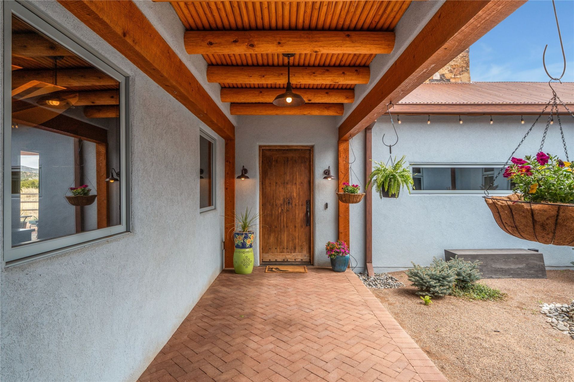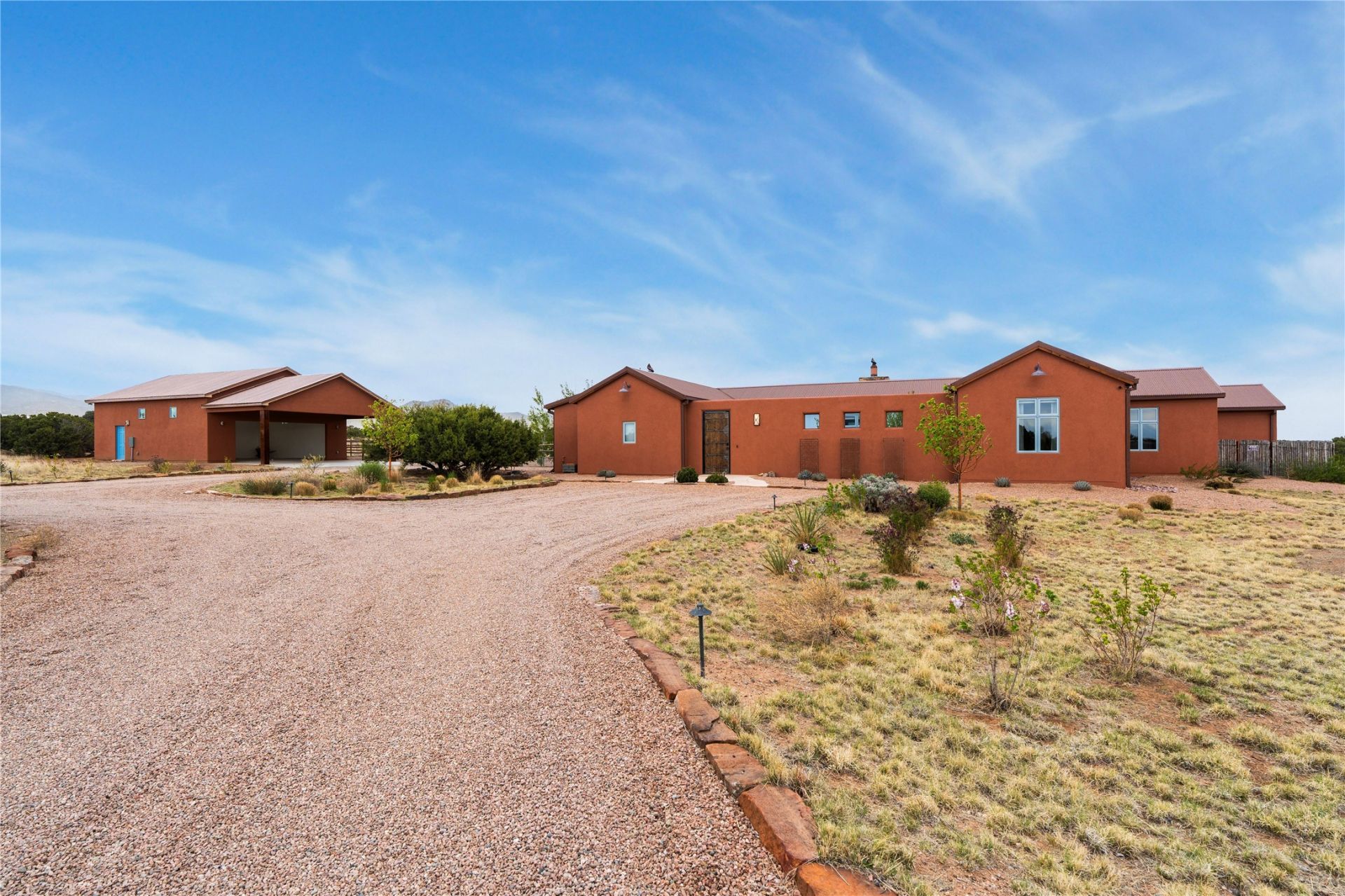 Come to where the bluebirds gather and the American West still calls. Set on an expansive 10-acre lot with large views in Arroyo Hondo, this 2022 custom-built property by Green Star Builders, is home to an exquisite 3-bedroom main house and 2-bedroom casita, rich in character and craft. Echoes of Western heritage ? a living room with a hand chiseled and stacked stone fireplace and a vaulted beam ceiling ? are softened with a touch of Santa Fe whimsy ? warm American Clay plaster walls and a kitchen with cabinets that match our vast blue skies transposed next to mosaic tile backsplash. The entry leads to a grand living room with picture windows framing the view of rolling plains and foothills beyond. Any home chef will be called by the large and modern kitchen with the attached prep kitchen. Beyond the kitchen, a dining area flows into an intimate media room and office. The main house is completed with three generous bedroom suites, with bespoke bathroom finishes and large closets. The casita welcomes guests with a large living / game room. The second casita bedroom also serves as an excellent office or gym. This is a property that will never be found lacking. In addition to the main-house 2-car garage, there is a recently-built and heated additional 2-car garage, which will speak to the car collector or provide an excellent workshop or the start of an equestrian barn. The exterior boasts a spacious portal, two fenced dog runs and enclosed archery range. Green features include a photovoltaic solar electric array linked to two Tesla power wall battery backup units and an EV car charger. Walk, bike or ride out the backdoor as the property abuts the incredible Rail Trail, a 15-mile multi use trail that extends from downtown Santa Fe to Lamy. 86 Droege offers something so rarely found: a recently constructed, gated compound that exudes character and thoughtful design with views, acreage, privacy, modern green features, two garages with direct access to trails.